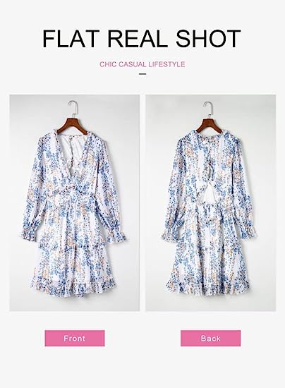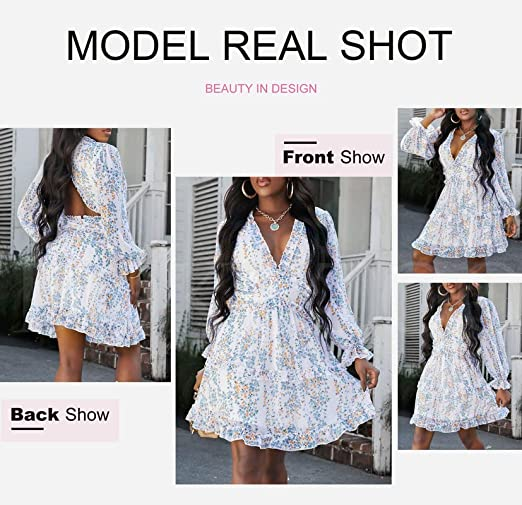 Dokotoo Womens 2023 Spring Summer Deep V Neck Ruffle Long Sleeve Floral Print Mini Dress