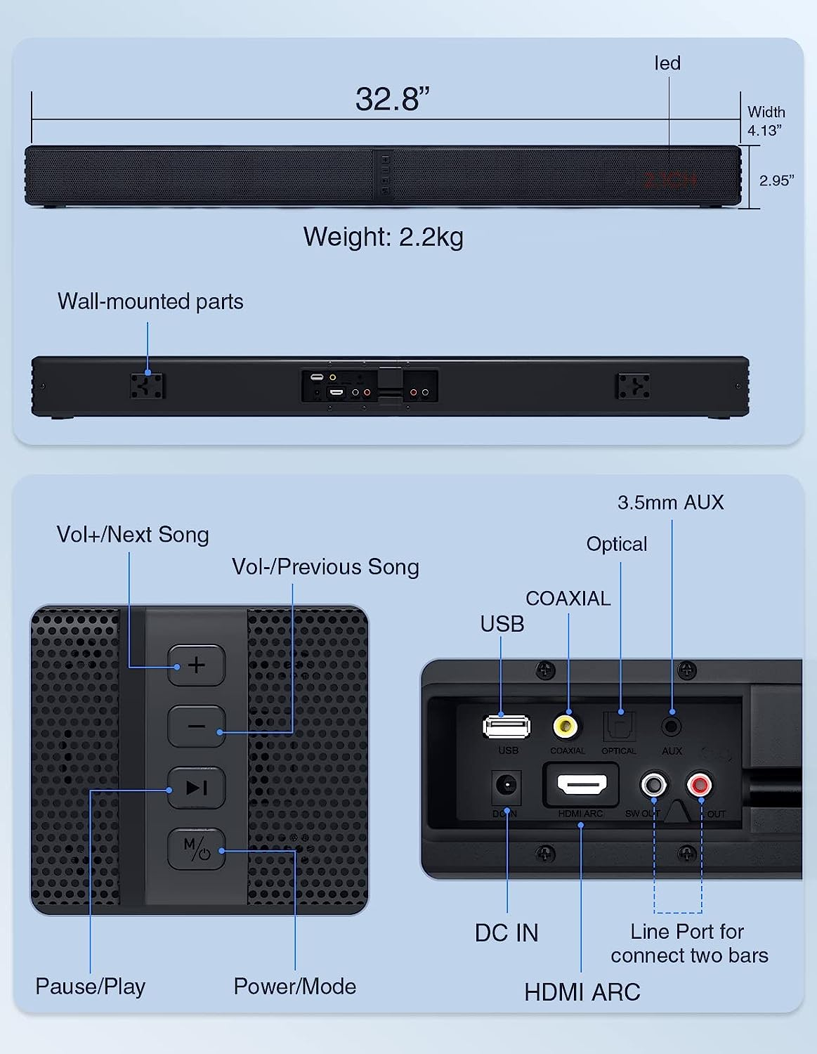 Puxinat 2 in 1 Separable Sound Bars for TV, 2.2 Channel 32Inch Bluetooth 5.0 TV Speaker for Surround Sound System, Built-in Dual Subwoofer, Bass Adjustable, Remote Control Included