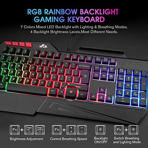 Rii RK202 RGB Gaming Keyboard Multiple Color Rainbow LED Backlit USB Wired Gaming Keyboard with Wrist Rest for Windows & Mac PC Gamers (Black)